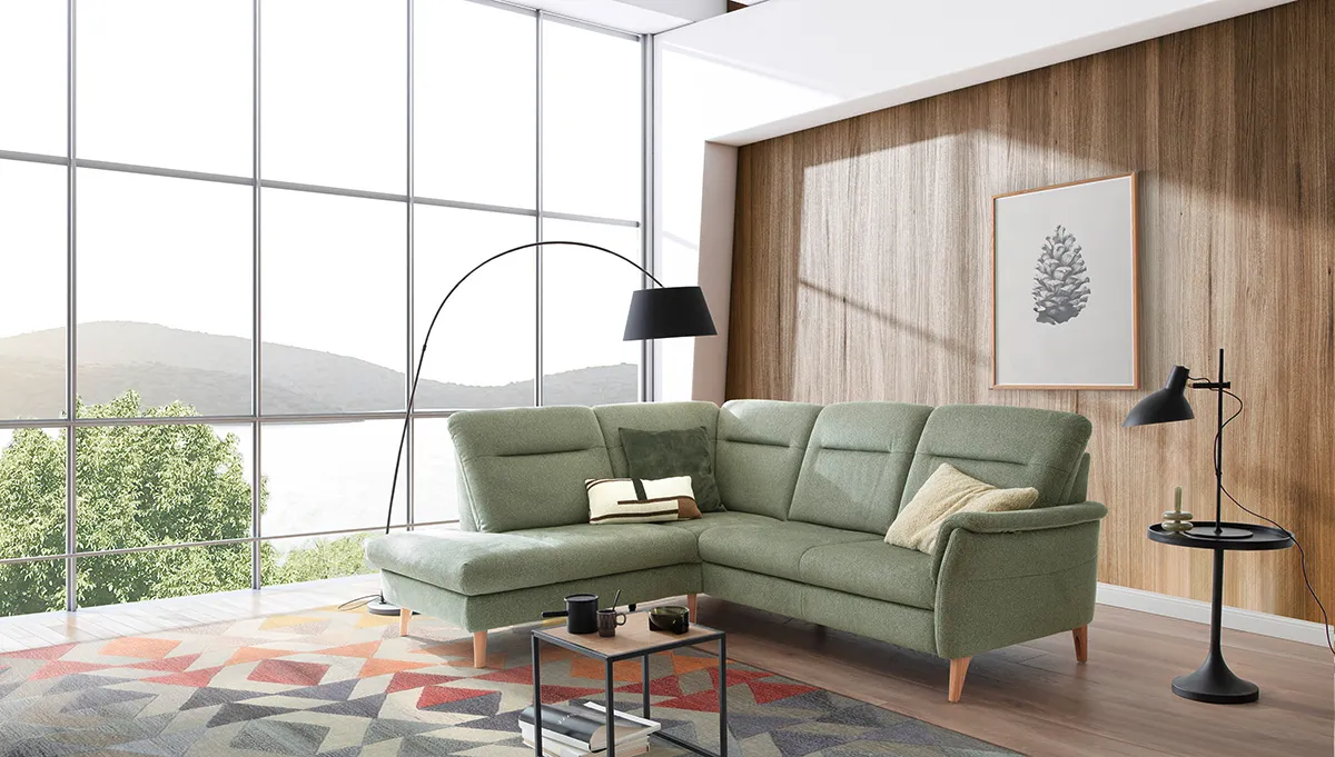 Die abgebildete Eckkombination, Stellmaß ca. 200 x 242 cm, erhalten Sie in dem gezeigten Stoff Danilo zum Bestpreis von 2648 €.